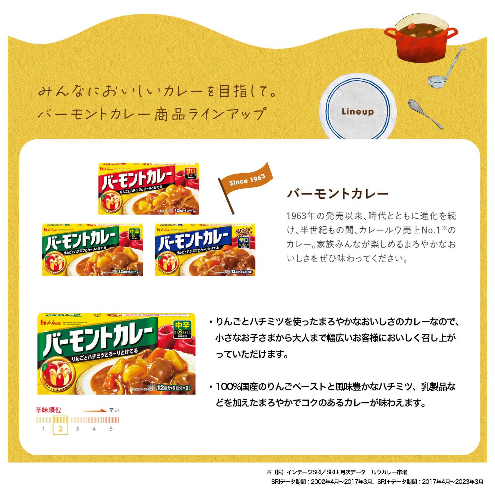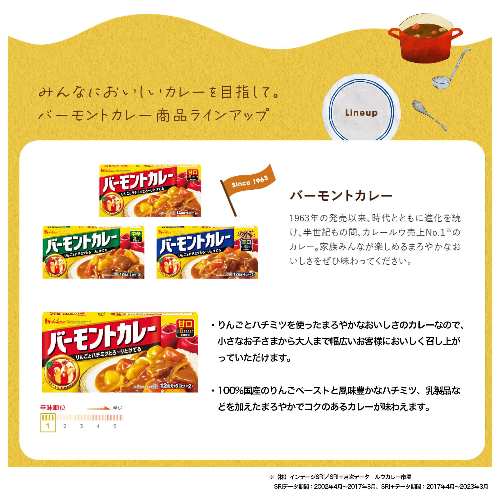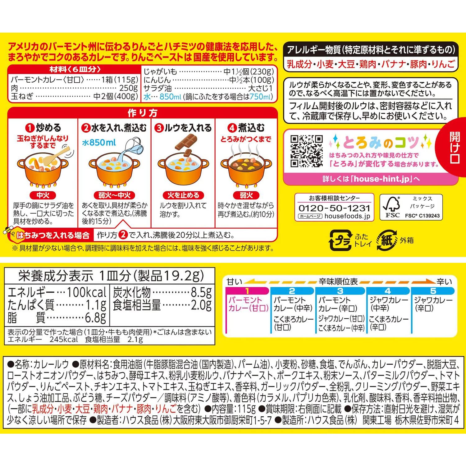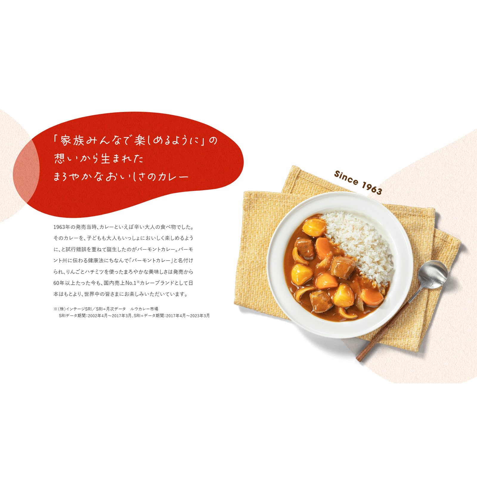 ・リンゴとハチミツを使ったまろやかなおいしさのカレーなので、小さなお子さまから大人まで幅広いお客さまにおいしく召し上がっていただけます。 ・アメリカのバーモント州に伝わるりんごとハチミツの健康法を応用したカレー・マイルドなスパイスの風味が特徴のカレーパウダーがベース・100%国産のりんごペーストと風味豊かなハチミツ、乳製品などを加えたまろやかでコクのあるカレー