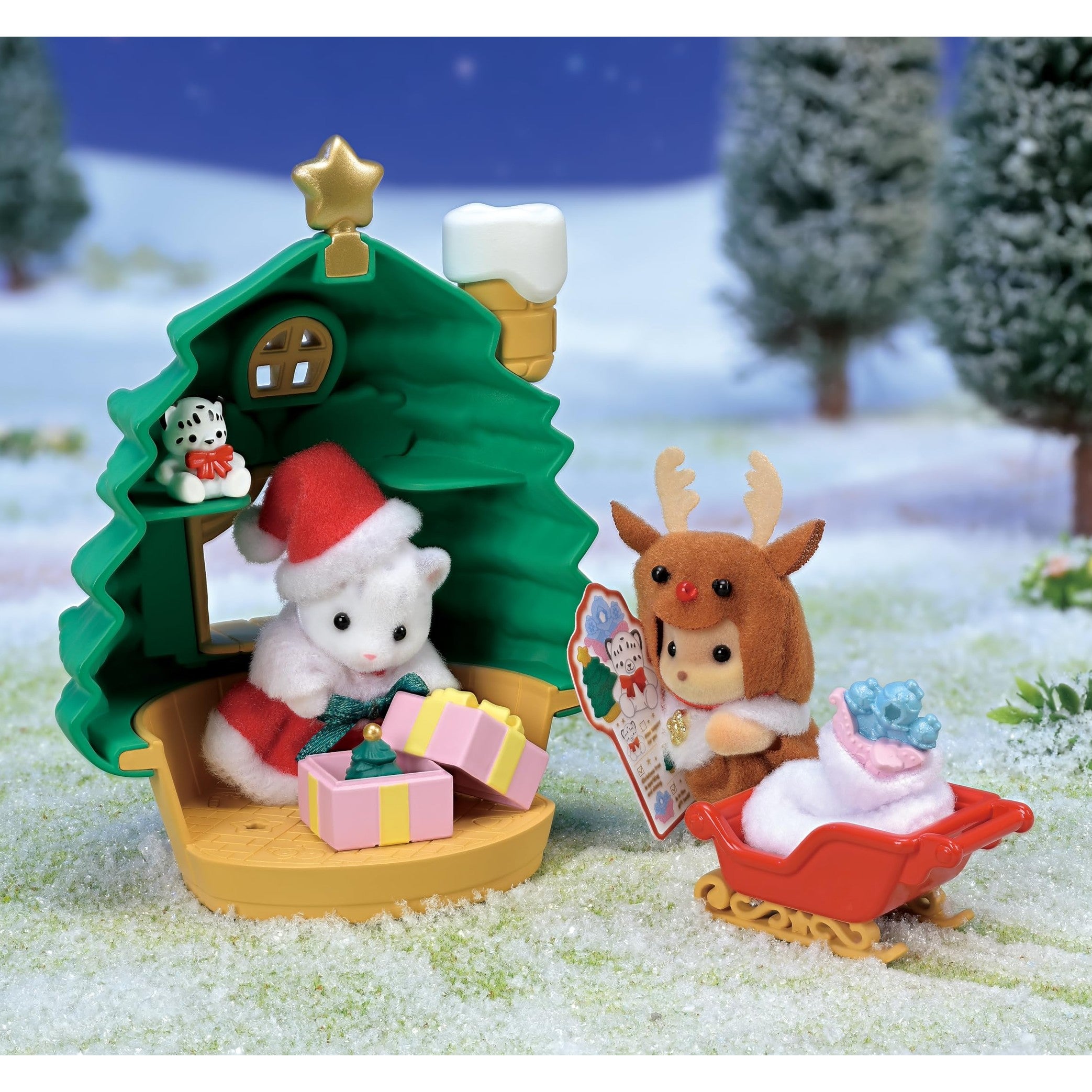 *Set includes small house with Christmas tree motif, sledding, baby leopard and caramel can, and small items.